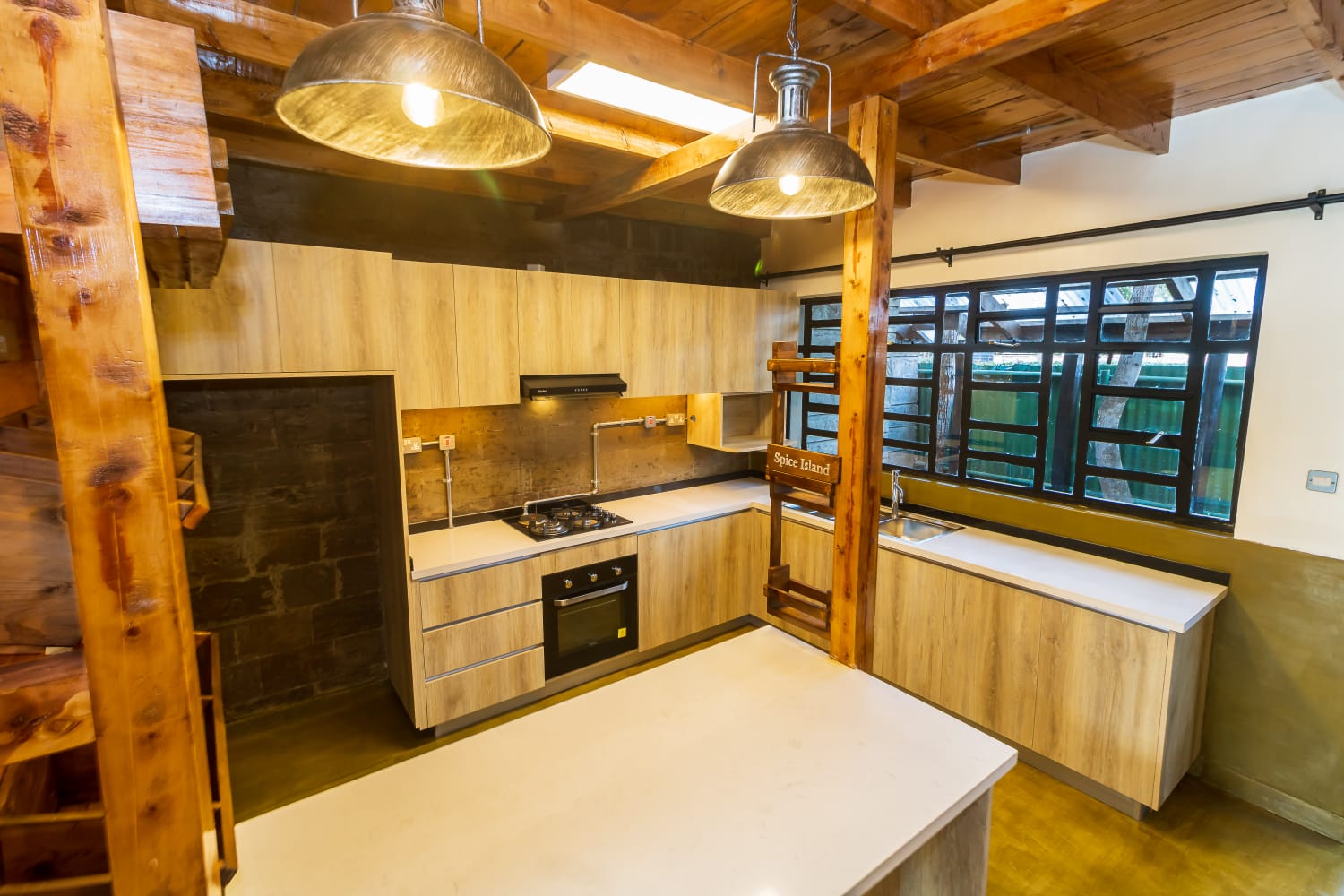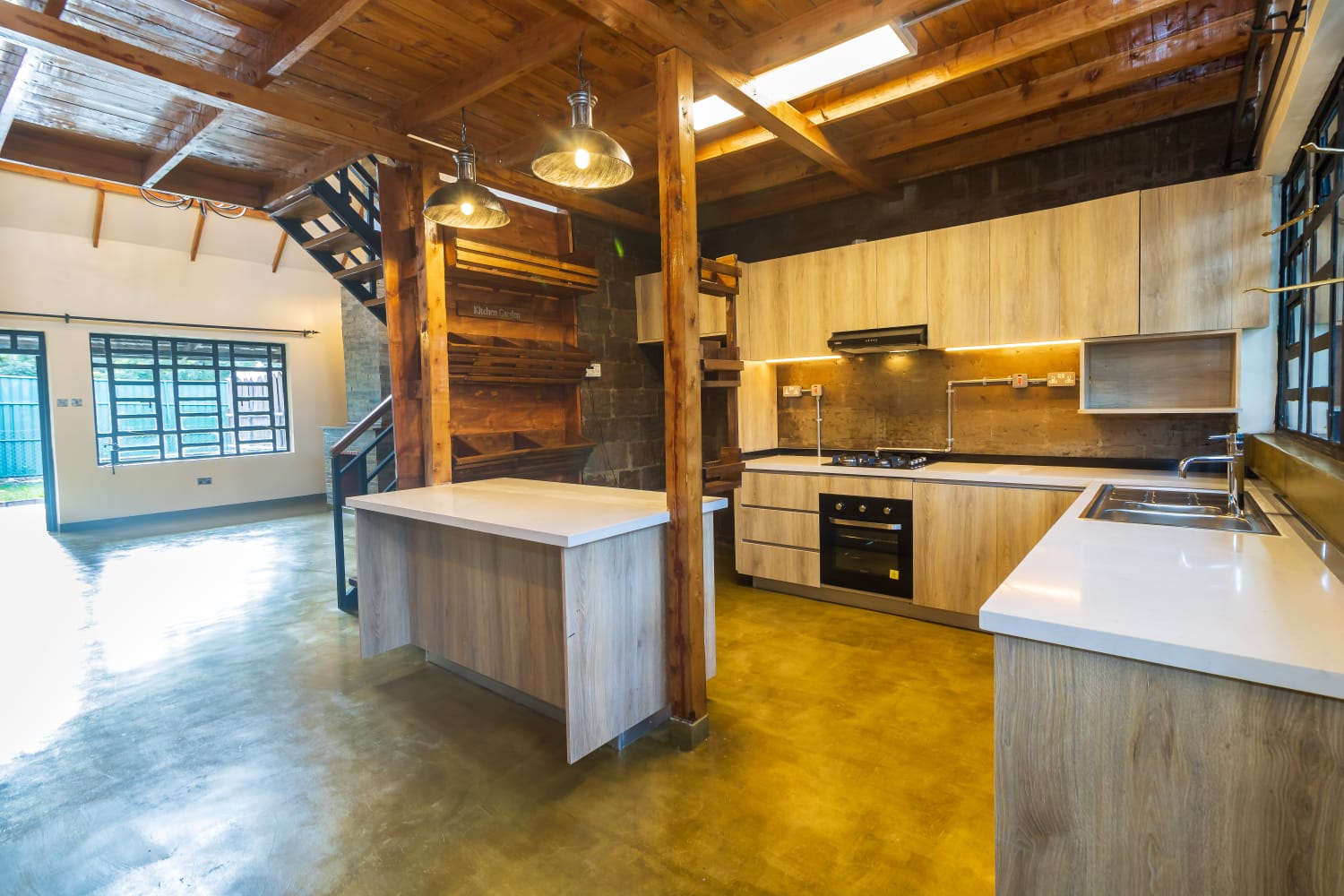 • Kitchen fitted with stove and oven.